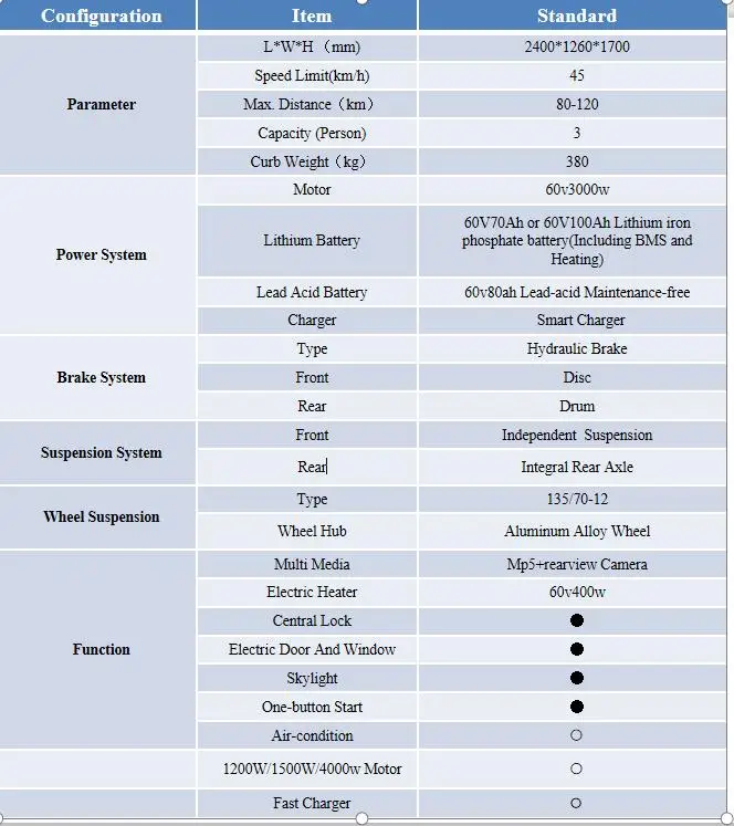 Parámetros del vehiculo de pasajeros para adultos de 4 ruedas eléctrico