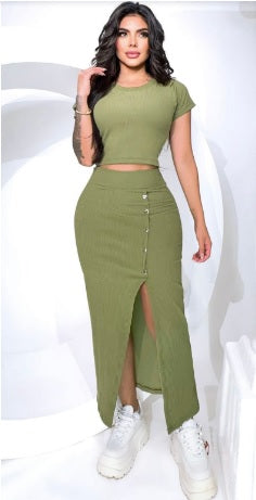 Descubre la esencia de la elegancia casual con nuestro conjunto de dos piezas, perfecto para un toque en estilo París, este conjunto se compone de un top cropped de manga corta y una falda midi acanalada, ambas prendas que tenemos disponibles en vibrantes colores ocre, verde, beige y negro, Confeccionadas en algodón suave, garantizan la máxima comodidad y una caída excepcional que realza tu figura. La falda presenta un cómodo tajo lateral, acentuado con detalles de botones plateados que le añaden un encanto único.