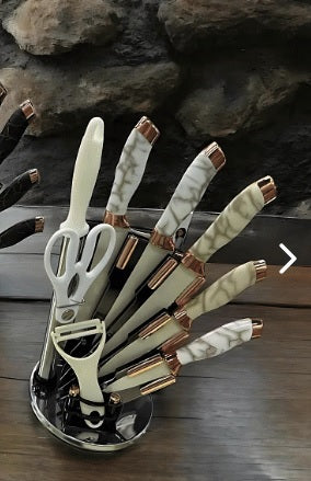 - Soporte elegante: Exhibe con orgullo tus cuchillos favoritos, el afilador y el pelador, manteniendo tu cocina organizada y estilizada.