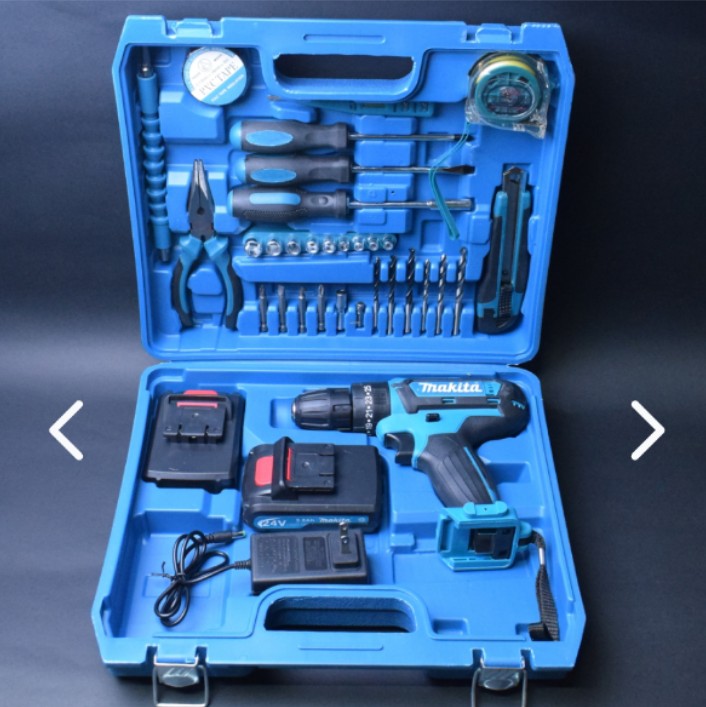 2 baterías, Cargador Mandril de 3/81, extensor, 9 copas de 5mm, 6mm, 7mm, 8mm, 9mm, 10mm, 11mm, 12mm y 13mm, 8 puntas,             6 brocas, estuche plástico de transporte.